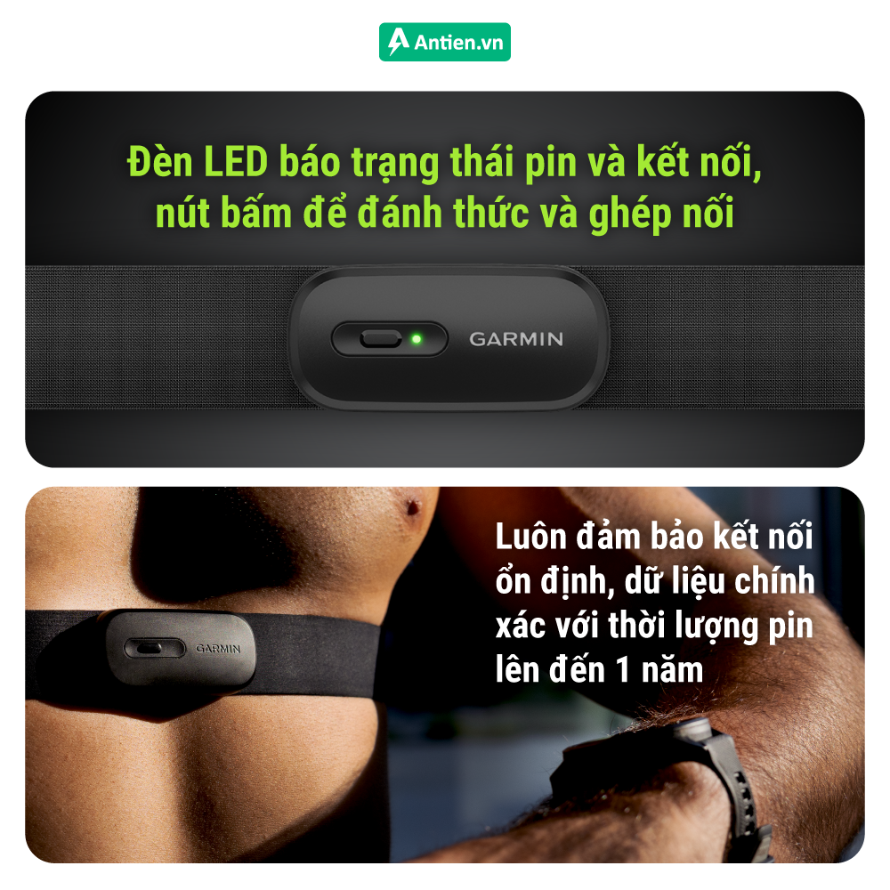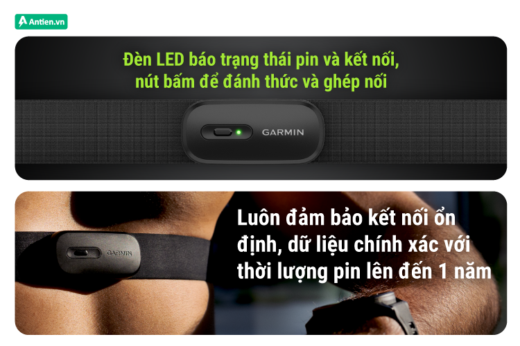Điểm nhấn độc đáo nhất trên HRM 200 là đèn LED nhỏ - lần đầu tiên xuất hiện trên dây đeo nhịp tim nhà Garmin. Đèn sẽ nhấp nháy thông báo khi thiết bị đã sẵn sàng hoạt động, hoặc cảnh báo khi pin yếu, giúp bạn kiểm soát trạng thái kết nối chỉ trong một ánh nhìn. Với nút bấm, bạn có thể dễ dàng đánh thức và ghép nối máy theo dõi nhịp tim.