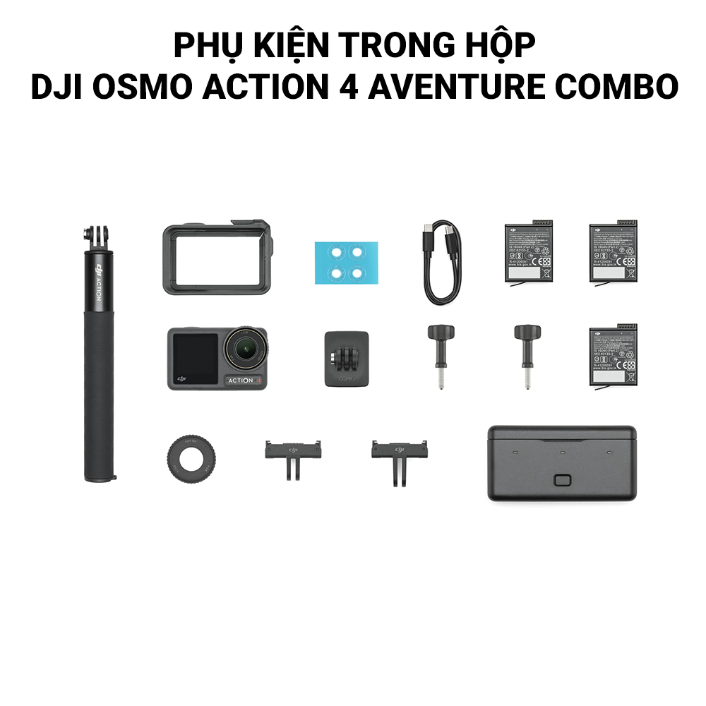 • Phụ kiện có trong combo gồm: 1 máy quay Action 4, 3 viên pin Extreme, 1 khung bảo vệ ngang - dọc, 1 đế dính cong, 2 vít khóa, 1 cáp sạc Type-C sang Type-C PD, 1 hộp đựng pin đa năng (tối đa 3 viên), 1 thanh nối dài 1,5m, 1 kính bảo vệ cảm biến, 1 bộ chống trượt Osmo Action, 1 bộ nhãn dán Sticker DJI