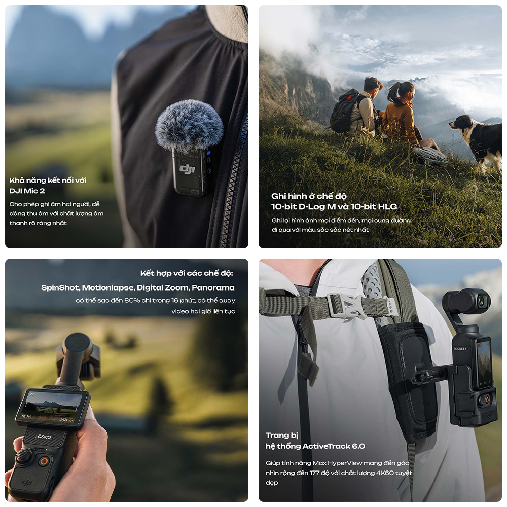 DJI Osmo Pocket 3 không chỉ nhỏ gọn, dễ mang theo mà còn hội tụ hàng loạt công nghệ quay – chụp tiên tiến: cảm biến lớn, khả năng ghi hình 4K sắc nét, màu sắc sống động với D-Log M 10 bit và HLG HDR, hệ thống âm thanh chất lượng cao, cùng nhiều tính năng hỗ trợ sáng tạo hiện đại.