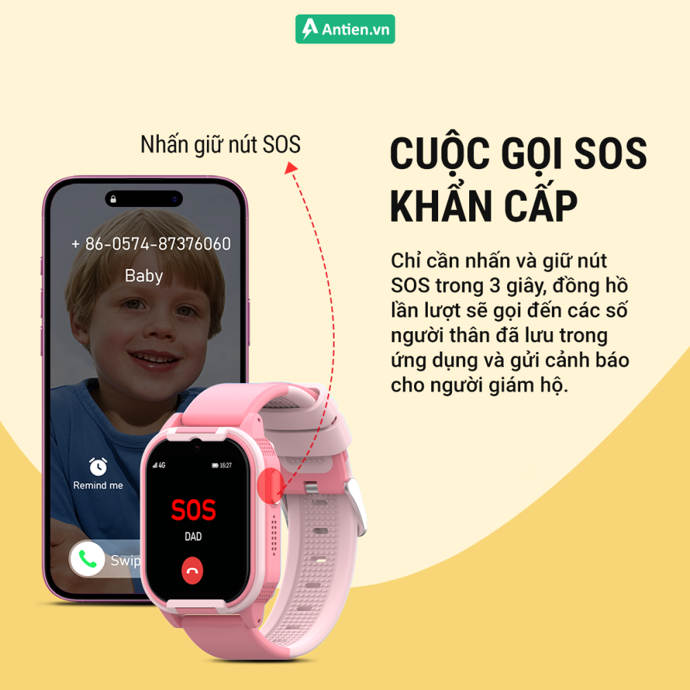 • Tích hợp cuộc gọi khẩn cấp SOS được cài đặt qua app với 03 số điện thoại liên hệ khẩn cấp khi gặp vấn đề. Chỉ với 1 nút bấm và thao tác đơn giản bé đã có thể gửi tín hiệu khẩn cấp SOS thiết lập cuộc gọi nhanh chóng tới 1 trong 3 số điện thoại được cài đặt sẵn.