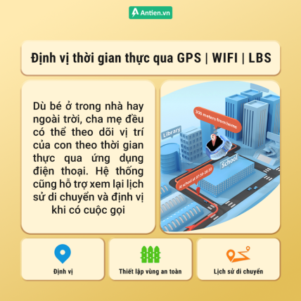 • Định vị chính xác với 3 công nghệ thời gian thực GPS, Wifi và LPS, giúp bố mẹ theo dõi con mọi lúc, mọi nơi.