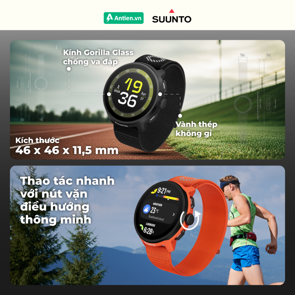Với kích thước 46 x 46 x 11,5 mm và trọng lượng chỉ 36 gram, đây chính là chiếc đồng hồ nhẹ nhất Suunto từng tạo ra - một lợi thế lớn cho những runner muốn bay bổng trong từng sải chân.