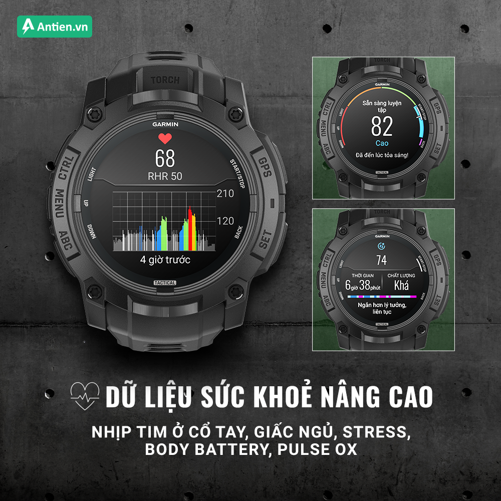Được thiết kế để hỗ trợ và chinh phục các mục tiêu sức khỏe từ thể chất đến tinh thần. Garmin Instinct 3 Tactical Amoled là người bạn đồng hành sâu sắc với cơ thể bạn, phân tích và đưa ra thông tin sức khoẻ cá nhân một cách toàn diện và chính xác.