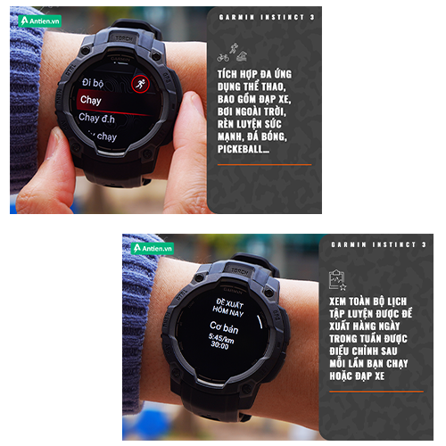 Là một thiết bị hỗ trợ thể thao toàn diện, Instinct 3 theo dõi các hoạt động, bao gồm đạp xe, bơi lội dưới nước, ba môn phối hợp, rèn luyện sức mạnh… đến các bộ môn đồng đội như bóng đá, pickeball… giúp người dùng tối ưu hóa hiệu suất và tập luyện một cách khoa học hơn.