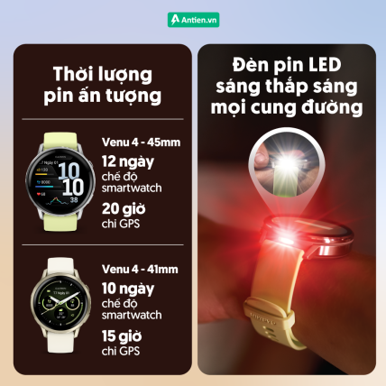 - Pin có giảm nhẹ so với Venu 3 nhưng thực tế vẫn 10-12 ngày tùy phiên bản, vẫn vượt xa đa số smartwatch màn AMOLED khác.