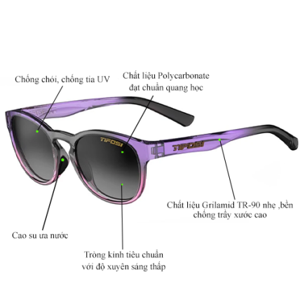 Kết hợp cùng lớp phủ chống chói đặc biệt của Tifosi được trang bị cho mặt kính làm giảm thiểu tối đa độ mạng của các người sáng chói. Nhờ vậy kính sẽ giúp mắt người đeo đỡ mệt mỏi, đau mắt và chống lóa khi sử dụng lâu dài. Ngoài ra mắt kính còn được trang bị khả năng chống tia cực tím 100% với độ bảo vệ mắt chuẩn UV400 giúp mắt người dùng luôn được bảo vệ tuyệt đối trước các tác hại của ánh nắng mặt trời khi người dùng tập luyện hay hoạt động ngoài trời trong thời gian dài.