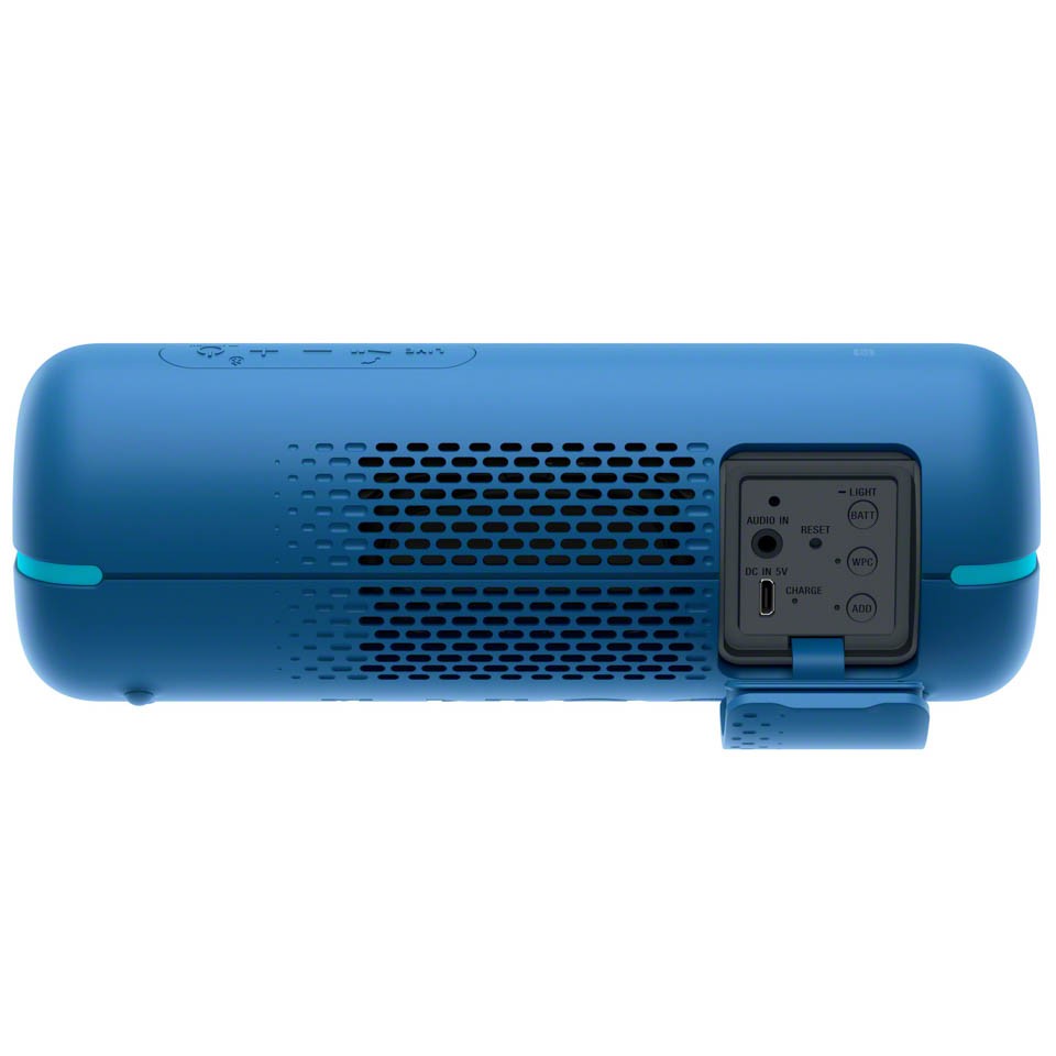 Mặt sau là các lỗ khí thông hơi và cổng kết nối của chiếc loa. Những cổng kết nối này lại được đặt trong hốc nhỏ, điều này giúp tối ưu khả năng chống nước của thiết bị, các cổng kết nối của Sony SRS-XB22 gồm cổng sạc, cổng audio 3.5mm và các nút chức năng điểu khiển đèn của thiết bị.