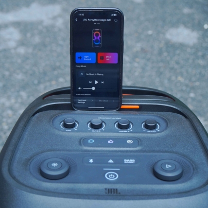 JBL Partybox Stage 320 cũng sẽ sở hữu hệ thống LED RGB phong cách ở mặt trước. Mặt điều khiển của loa được thiết kế dạng nút bấm kết hợp cụm núm xoay thông minh. Điều này sẽ giúp cho người dùng có thể sử dụng một cách tiện lợi cũng như không mất quá nhiều thời gian để làm quen với loa.