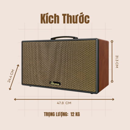 Paramax Aura có kích thước gọn nhẹ (47.8 x 31.3 x 24.4 cm) và nặng khoảng 12kg, trang bị tay xách tiện lợi giúp bạn dễ dàng mang theo đến mọi nơi. Thùng loa được chế tạo từ gỗ chắc chắn, phủ lớp da cao cấp bên ngoài, không chỉ tăng độ bền mà còn hạn chế va đập từ môi trường bên ngoài. Phía trước loa là lưới ê căng vải họa tiết caro bắt mắt, nổi bật với logo PARAMAX – vừa tăng tính nhận diện thương hiệu vừa đảm bảo yếu tố thẩm mỹ.