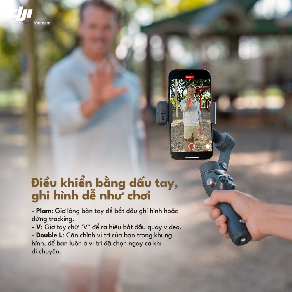 Bên cạnh đó, DJI Osmo Mobile 8 còn hỗ trợ điều khiển bằng cử chỉ, giúp thao tác quay chụp trở nên tự nhiên hơn. Người dùng có thể bắt đầu theo dõi, chụp ảnh hoặc điều chỉnh khung hình chỉ bằng một vài cử chỉ đơn giản, rất tiện lợi khi quay một mình.
