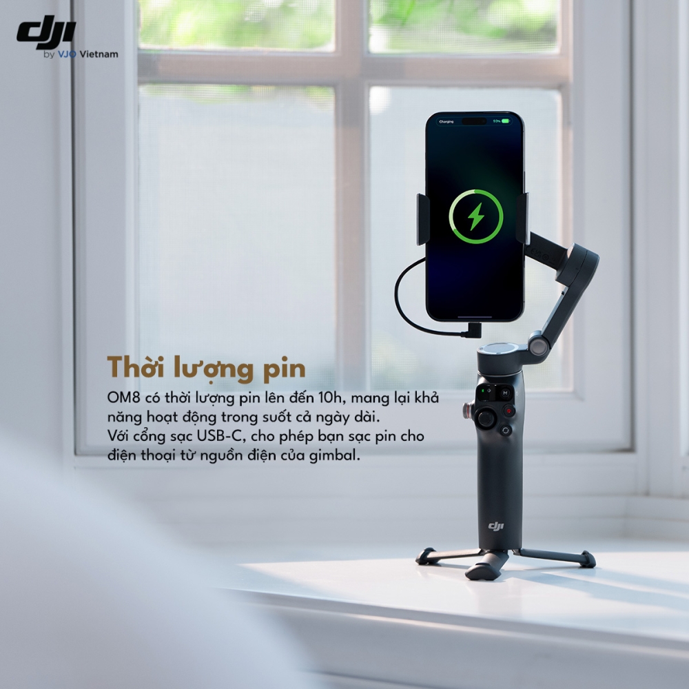 Một ưu điểm đáng chú ý khác của DJI Osmo Mobile 8 là thời lượng pin lên đến 10 giờ. Đây là mức pin đủ để người dùng quay vlog, livestream hoặc sáng tạo nội dung trong suốt ngày dài mà không quá lo lắng về việc gián đoạn giữa chừng.