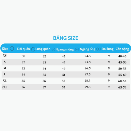 | Size | Dài quần (cm) | Lưng quần (cm) | Ngang mông (cm) | Ngang ống (cm) | Đai lưng (cm) | Cân nặng (kg) |
