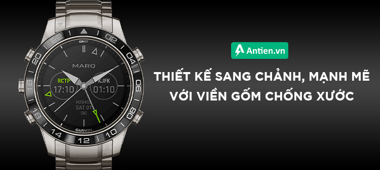 Lấy cảm hứng từ ngành hàng không, đồng hồ Garmin MARQ Aviator được chế tạo từ các vật liệu cao cấp trong một thiết kế sang trọng. Viền gốm chống xước 46mm bắt đầu thiết kế với độ chi tiết mạnh mẽ, sau đó được phủ một lớp kim loại mỏng và được đánh bóng để sáng bóng như gương. Vòng đeo tay titan dạng cánh xuôi dẫn đến khóa an toàn có thể điều chỉnh vi mô để vừa vặn cao cấp.