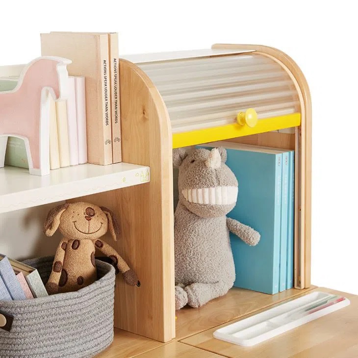 • Giá sách hai tầng cung cấp một không gian lưu trữ lớn cho sách và phụ kiện để trẻ học cách phân loại khoa học. Đồng thời thiết lập bảng từ tính ghi chú các ngày trong tuần để trẻ note những công việc quan trọng.