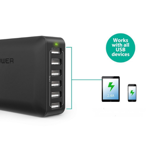Sạc tất cả thiết bị của bạn từ một ổ cắm với bộ sạc tường 6 cổng RAVPower. Củ sạc nhỏ gọn và an toàn này có công suất tổng cộng 60 W để sạc 6 điện thoại thông minh và máy tính bảng của bạn đồng thời ở tốc độ cao.