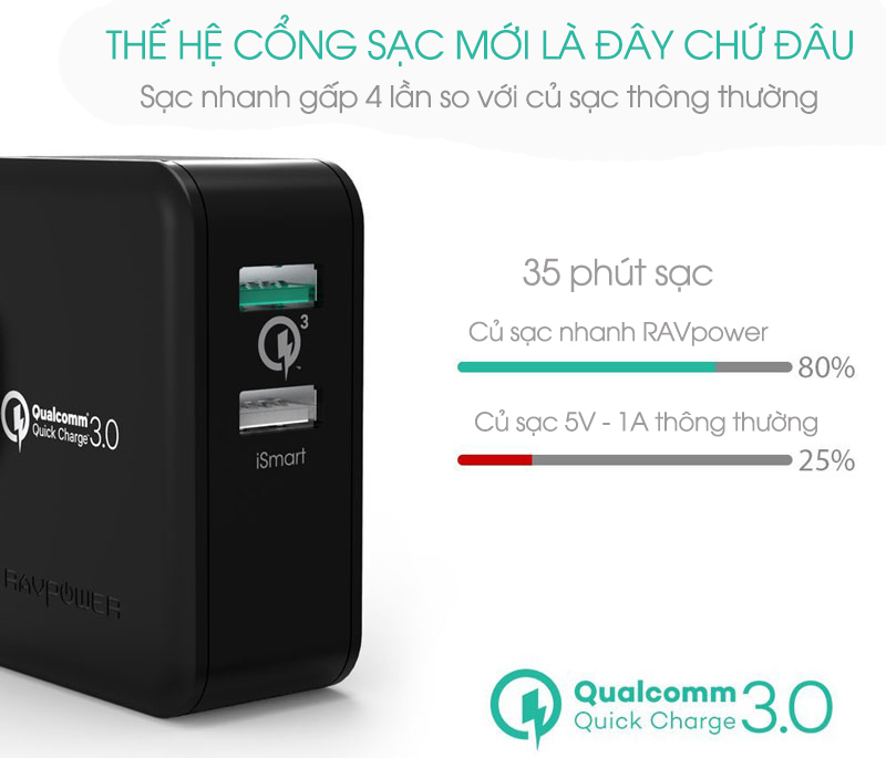 Công nghệ sạc thông minh iSmart độc quyền của Ravpower cùng với cổng sạc nhanh 3.0, tiết kiệm thời gian sạc cũng như tiết kiệm tối đa điện áp trong quá trình sử dụng.