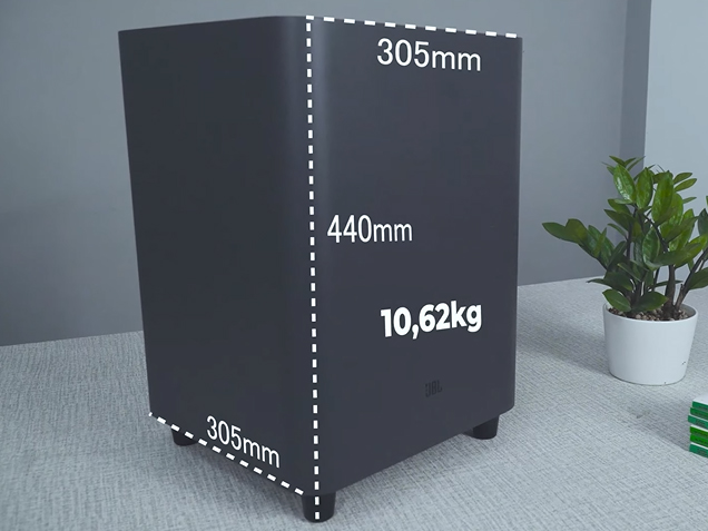 Chiếc Subwooofer của JBL Bar 5.1 Surround có kích thước 305 x 440 x 305mm cùng trọng lượng 10.62 kg giúp âm thanh sống động hơn, trải nghiệm hiệu ứng âm thanh thú vị với những bộ phim bom tấn hay tận hưởng những bài nhạc với âm bass được tăng cường.