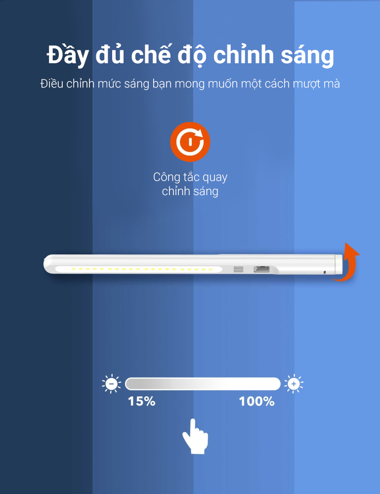 Đèn học Taotronics TT-DL1010 có thể dễ dàng thay đổi mức độ sáng khác nhau chỉ bằng 1 nút bấm dể dễ dàng lựa chọn phù hợp mọi hoàn cảnh sử dụng. Đèn có thể sử dụng trong 2 - 28 tiếng tùy mức sáng s\r dụng.