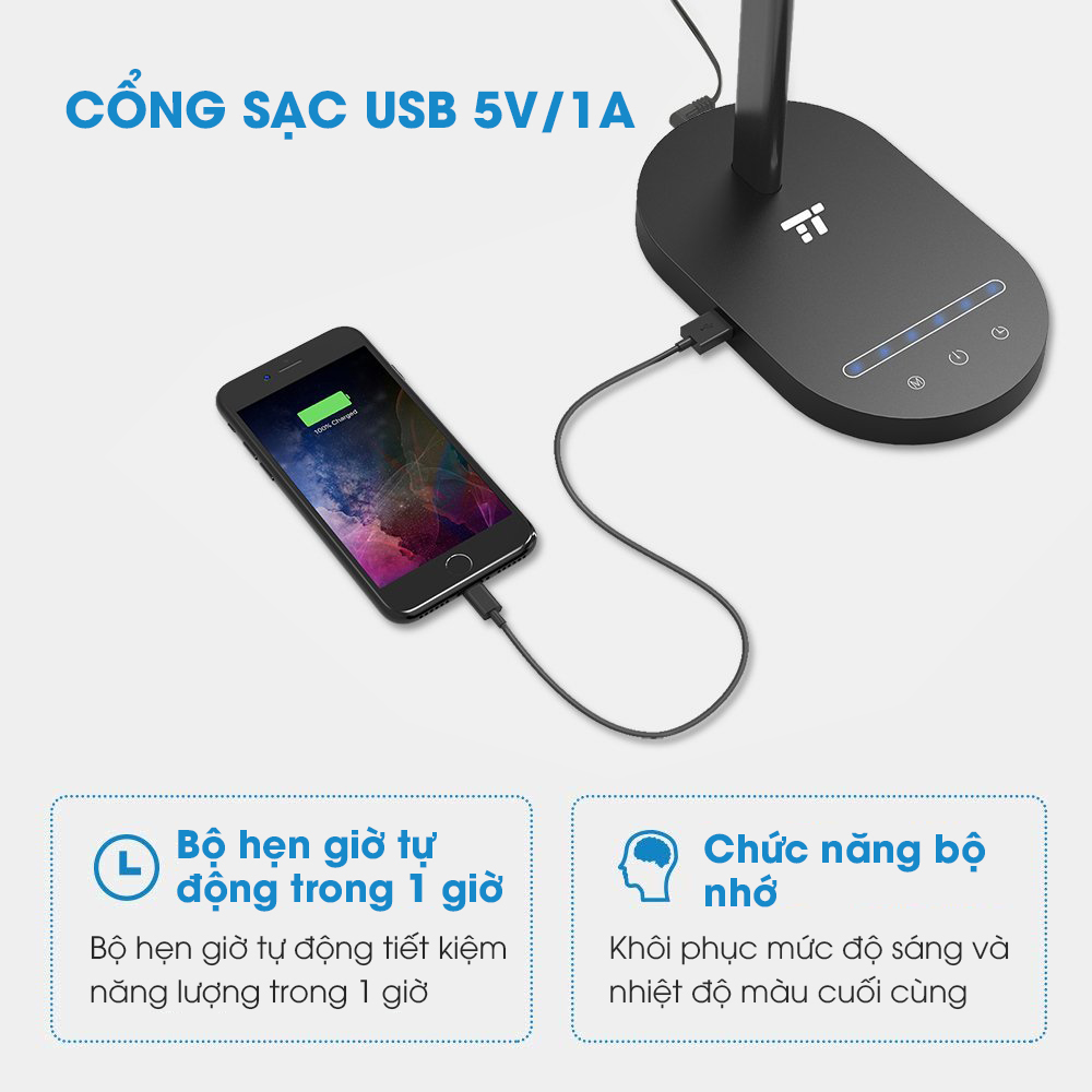 Được thiết kế với nhiều tính năng hơn là chỉ đơn giản làm sáng phòng, đèn bàn TaoTronics được tích hợp nhiều tính năng tiện dụng cho bạn. Đầu ra USB 5V / 1A được tích hợp cho phép sạc các thiết bị di động của bạn trong khi vẫn giữ chúng trong tầm tay.