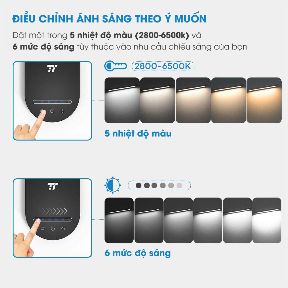 Một trong những lợi thế lớn của đèn LED là mức độ tùy biến cao. Đèn bàn học, bàn làm việc TaoTronics TT-DL030 cho phép bạn lựa chọn giữa 5 nhiệt độ màu (2800-6500K) và 6 mức độ sáng, do đó bạn sẽ luôn có ánh sáng phù hợp nhất tùy thuộc vào thời gian trong ngày hoặc hoạt động của bạn.