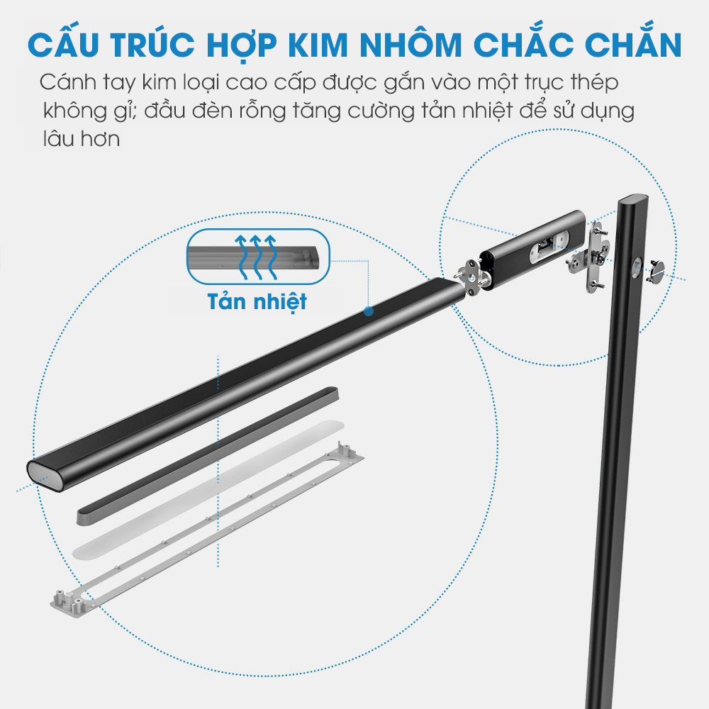 Đèn bàn LED TaoTronics TT-DL030 với cấu trúc hợp kim nhôm cao cấp, đàn hồi được giữ lại với nhau bằng một trục thép không gỉ bền giúp đèn chắc chắn, bền bỉ hơn nên bạn yên tâm ngồi học hay làm việc hàng ngày. Thiết kế rỗng của đầu đèn giúp tản nhiệt cho bảng LED dài tốt hơn.
