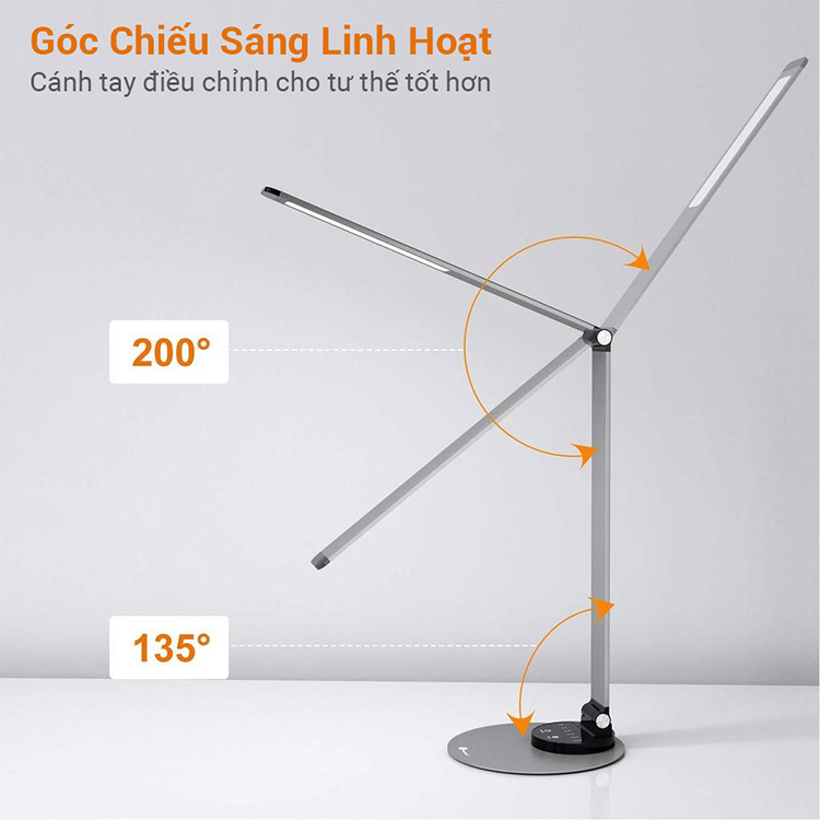 Bạn cũng có thể điều chỉnh góc sáng đơn giản với cánh tay đèn xoay lên đến 200° hoặc xoay đế 135° đảm bảo cho bạn có được góc đọc sách hay làm việc hiệu quả.