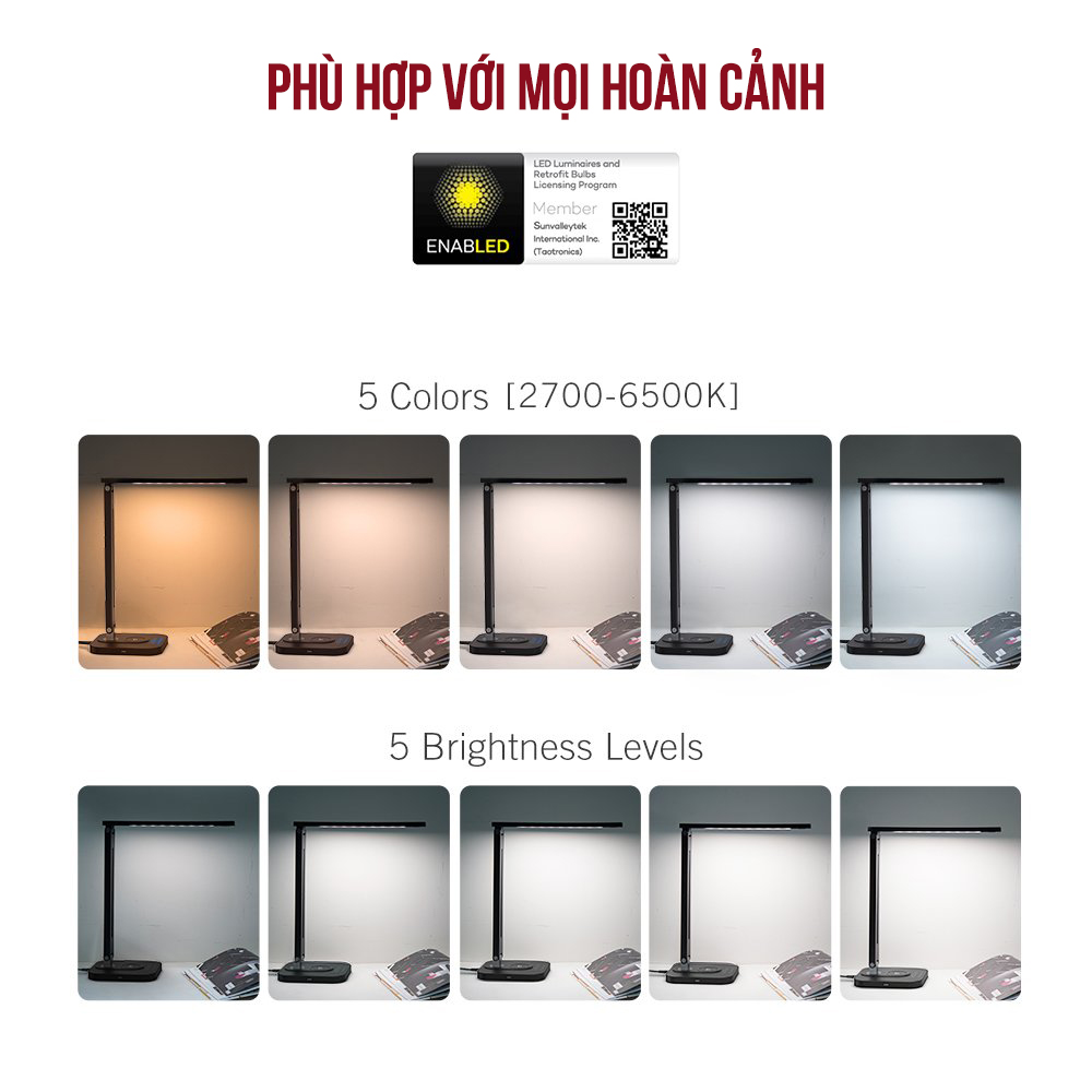 Một trong những lợi thế lớn của đèn LED là mức độ tùy biến cao. Đèn để bàn chống cận Taotronics TT-DL038 cho phép bạn lựa chọn giữa 5 nhiệt độ màu (2800-6500K) và 5 mức độ sáng, do đó bạn sẽ luôn có ánh sáng phù hợp nhất tùy thuộc vào thời gian trong ngày hoặc hoạt động của bạn.