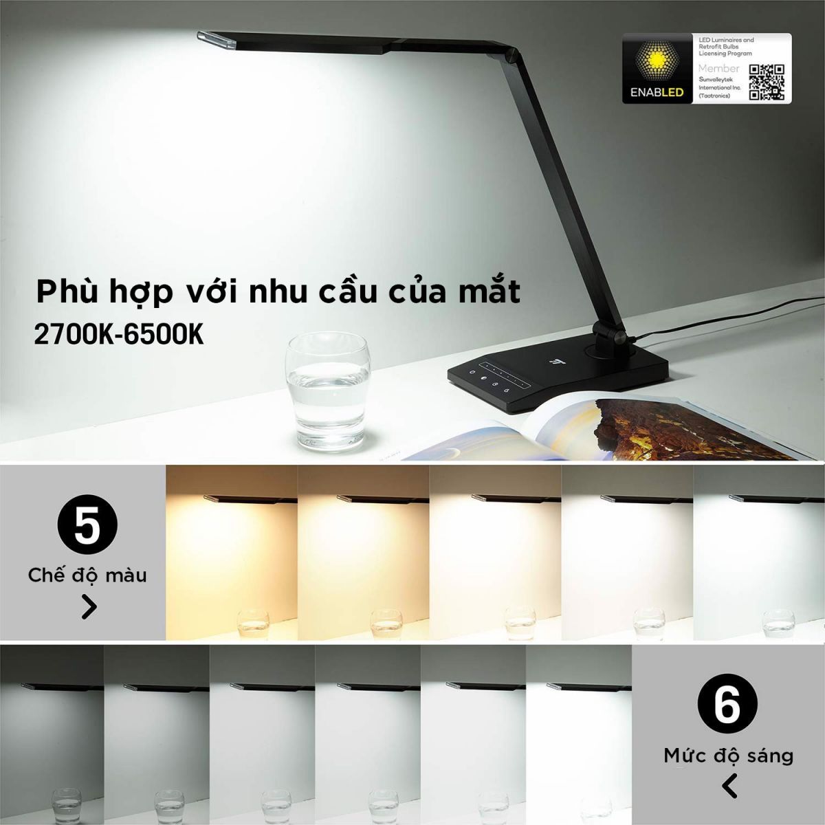 Một trong những lợi thế lớn của đèn bàn chống cận là mức độ tùy biến cao. Đèn LED chống cận TaoTronics TT-DL048 cho phép bạn lựa chọn giữa 5 chế độ đèn độc đáo và 6 mức độ sáng, do đó bạn sẽ luôn có ánh sáng phù hợp nhất tùy thuộc vào thời gian trong ngày hoặc hoạt động của bạn.