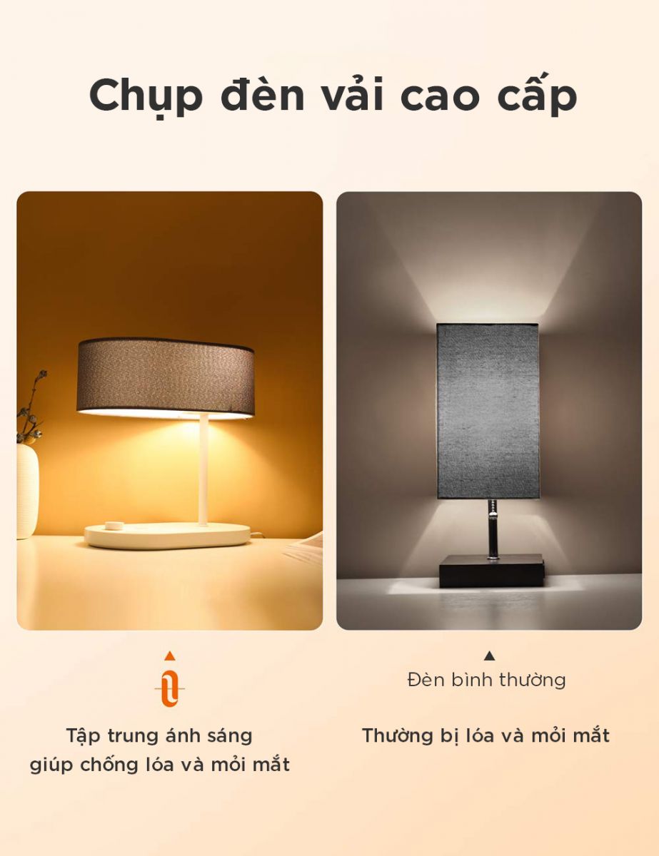 • Chụp đèn bằng vải cao cấp: Bóng PC dày dặn ngăn chặn sự rò rỉ ánh sáng từ phía trên chụp đèn để chiếu sáng rõ ràng, tập trung và thiết thực, giảm thiểu chói và mỏi mắt