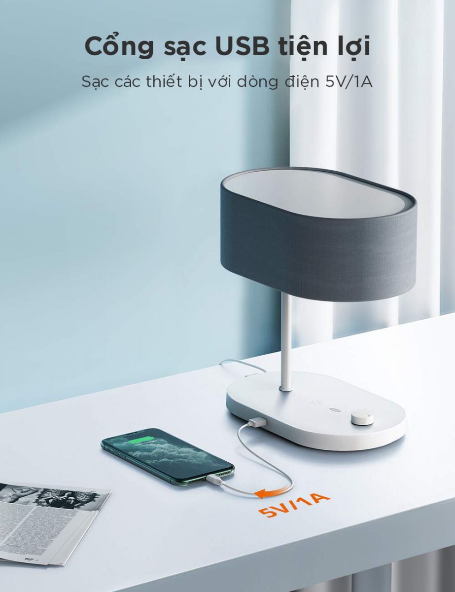 • Cổng sạc USB: Cổng USB tiện lợi trên đế sạc điện thoại thông minh, iPad, pin sạc dự phòng, máy tính xách tay, máy tính bảng và các thiết bị có cổng USB (5V / 1A) khi đèn của bạn bật hoặc tắt