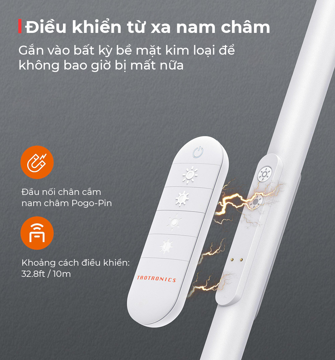 Ngoài ra đèn còn được trang bị 1 điều khiển từ xa giúp bạn tiện lợi hơn khi sử dụng. Và cũng dễ dàng sạc lại, chỉ việc gắn điều khiển từ xa với nam châm trực tiếp vào cột đèn để sạc. Bạn cũng có thể điều khiển đèn trực tiếp qua 2 nút bấm ở thân đèn để chuyển qua 5 mức độ sáng và màu một cách mượt mà.