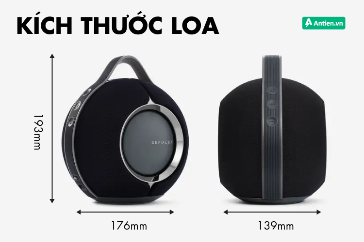 Devialet Mania có thiết kế cực kì gọn gàng với kiểu dáng hình cầu như các tàu vũ trụ, kích thước các chiều là 17.6 x 13,9 x 19.3 cm và trọng lượng thì cực kì nhẹ chỉ 2.3 kg. Ở phía trên loa là một chiếc quai xách nho nhỏ để các bạn có thể xách loa đi chơi. Chạy dọc thân loa chúng ta sẽ có các nút điều khiển như nút nguồn, tạm dừng phát nhạc, tăng giảm âm lượng, kết nối bluetooth và một nút để truy cập vào chế độ chạy pin của loa.