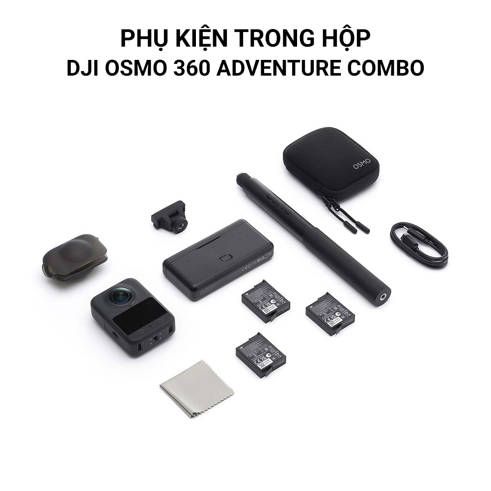 Ngoài ra, combo vẫn đi kèm các phụ kiện thiết yếu như túi bảo vệ máy ảnh, bảo vệ ống kính cao su, khăn lau ống kính và cáp sạc USB-C PD, giúp bạn luôn an tâm sáng tạo trong mọi điều kiện. Với Adventure Combo, DJI Osmo 360 không chỉ là một chiếc camera hành động, mà còn là người bạn đồng hành bền bỉ, sẵn sàng theo bạn đến bất kỳ đâu.