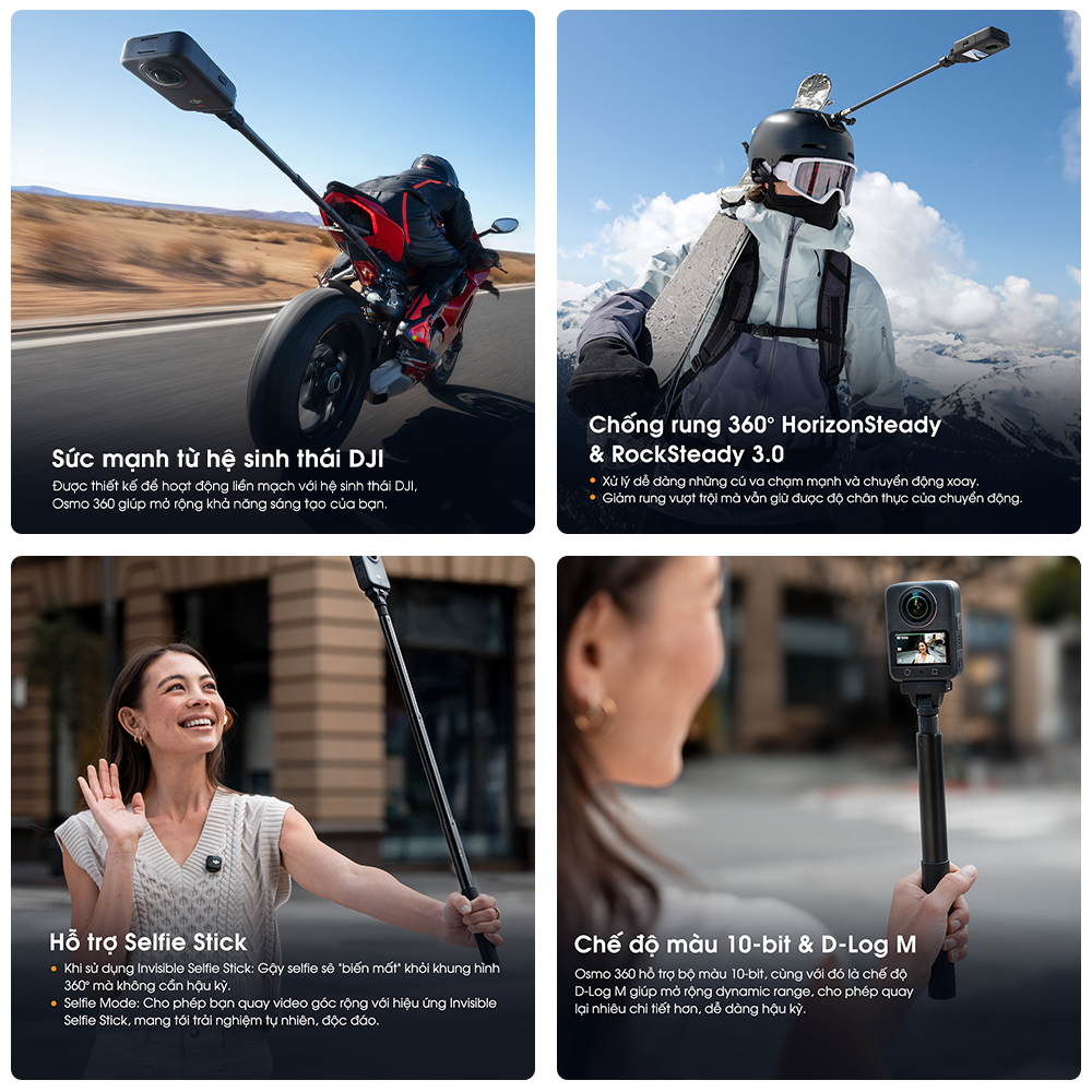 Với khả năng chuyển đổi nhanh giữa 360° và single-lens, cộng thêm chế độ selfie cùng Invisible Selfie Stick, Osmo 360 mang lại trải nghiệm vlog tự nhiên, mượt mà và chuyên nghiệp.