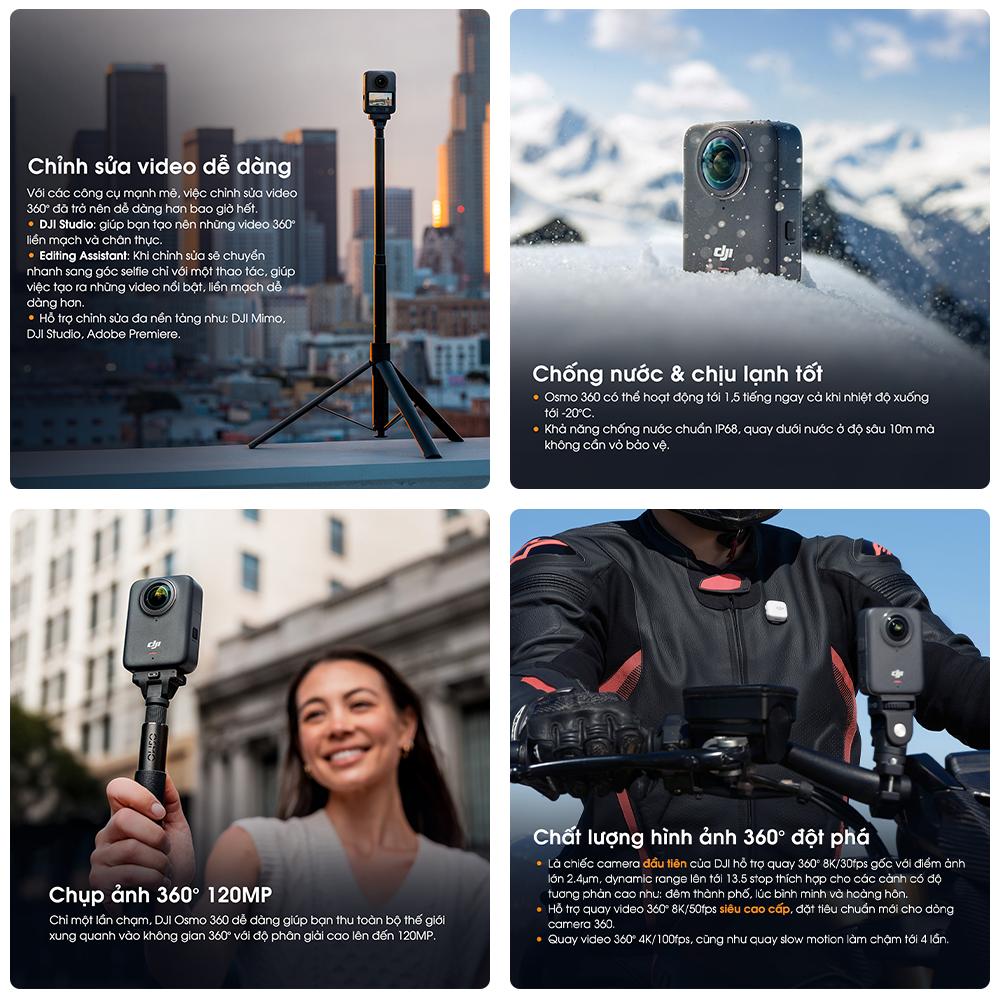 Không chỉ gọn nhẹ, Osmo 360 còn được tối ưu cho mọi môi trường khắc nghiệt nhất khi có thể hoạt động ổn định ở nhiệt độ xuống đến -20°C mà vẫn đảm bảo được độ sắc nét cho từng khung hình. Kết hợp với khả năng kháng nước cùng bụi bẩn chuẩn IP68 cho phép bạn có thể quay video, chụp ảnh thoải mái với độ sâu lên đến 10m mà không cần vỏ bảo vệ.