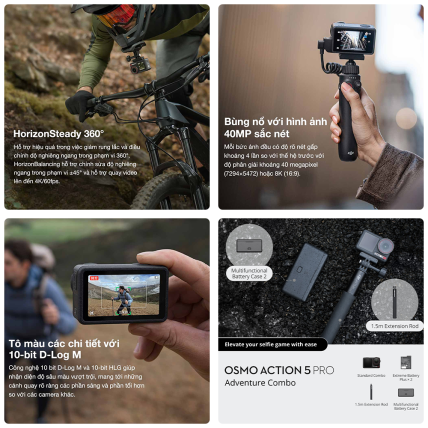 Với combo này, bạn luôn sẵn sàng cho những chuyến đi dài, quay liên tục nhiều giờ liền và linh hoạt thay đổi góc quay trên mọi địa hình. Adventure Combo chính là lựa chọn hoàn hảo cho dân du lịch, phượt thủ hay những ai muốn khai thác tối đa sức mạnh của Action 5 Pro.
