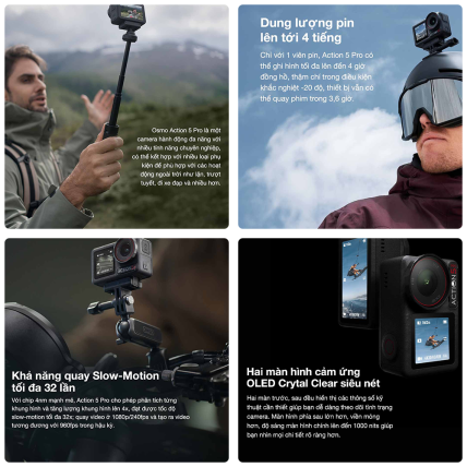 Action 5 Pro nâng cấp cảm biến 1/1.3" thế hệ mới với chip 4nm, quay 4K/120fps, slow-motion 32x, ảnh 40MP, pin 4 giờ và màn hình OLED sáng 1000 nits – vượt trội so với Action 4 cả về chất lượng hình ảnh lẫn thời lượng pin.