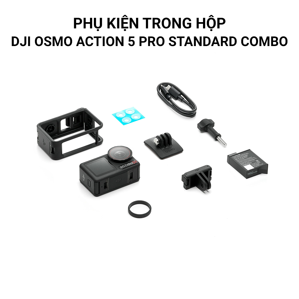 Với bản Standard Combo, DJI trang bị đầy đủ những phụ kiện cần thiết để bạn sẵn sàng quay ngay từ khi mở hộp. Bộ sản phẩm gồm một camera Osmo Action 5 Pro đi kèm pin Extreme Battery Plus, khung bảo vệ máy, ốp viền bảo vệ lens, cùng cáp sạc Type-C tốc độ cao.
