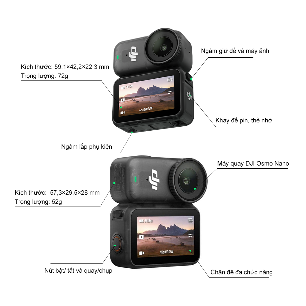 Với thiết kế nhỏ gọn, khả năng quay 4K mượt mà, cảm biến lớn, chống rung 3 trục, hiệu suất màu 10-bit cùng chế độ SuperNight, DJI Osmo Nano là lựa chọn lý tưởng cho người đam mê vlog, sáng tạo nội dung, du lịch hay các cảnh hành động ngoài trời. Trọn bộ phụ kiện đi kèm giúp bạn linh hoạt quay mọi góc độ, mọi tình huống, từ cảnh hành động nhanh đến phong cảnh rộng lớn, mà vẫn tiện lợi mang theo mọi lúc.