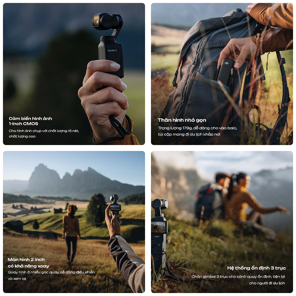 Mẫu Pocket 3 sẽ hoàn toàn phù hợp với kích thước nhỏ gọn, chống rung hiệu quả, pin ổn và quay video 4K HDR giúp bạn dễ dàng mang theo, quay cảnh đẹp, ghi lại hành trình mà không cần thiết bị cồng kềnh.