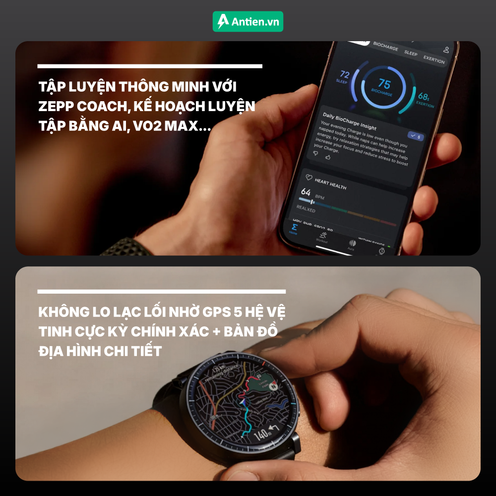 Đồng hồ hỗ trợ theo dõi sức mạnh thông minh với khả năng tự động ghi nhận số lần lặp, số hiệp và thời gian nghỉ, kết hợp Zepp Coach cá nhân hóa kế hoạch tập luyện bằng trí tuệ nhân tạo theo hiệu suất và khả năng phục hồi của bạn.