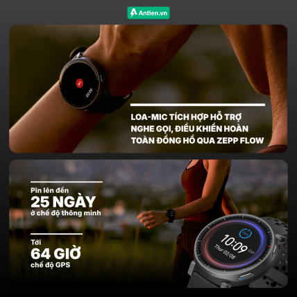 Đồng hồ hỗ trợ thanh toán NFC tiện lợi, kết hợp cùng bộ sưu tập mặt đồng hồ cao cấp đủ ấn tượng để bạn tự tin thể hiện phong cách mỗi ngày. Công nghệ Zepp Flow™ cho phép điều khiển đồng hồ bằng giọng nói, giúp bạn nhanh chóng kiểm tra tiến độ Zepp Coach™, điều chỉnh cài đặt và thao tác rảnh tay trong mọi tình huống.