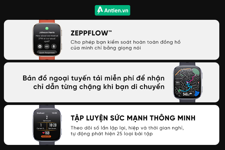 - Kiểm soát giọng nói toàn diện: Với trợ lý Zepp Flow tích hợp cho phép bạn kiểm soát hoàn toàn đồng hồ của mình chỉ bằng giọng nói. Dễ dàng điều chỉnh cài đặt, kiểm tra tiến trình Zepp Coach™, xem điểm sẵn sàng của bạn và nhiều hơn nữa - không cần chạm, vuốt hoặc ghi nhớ từ khóa, tất cả nhanh chóng, rảnh tay, tiện lợi hơn bao giờ hết.