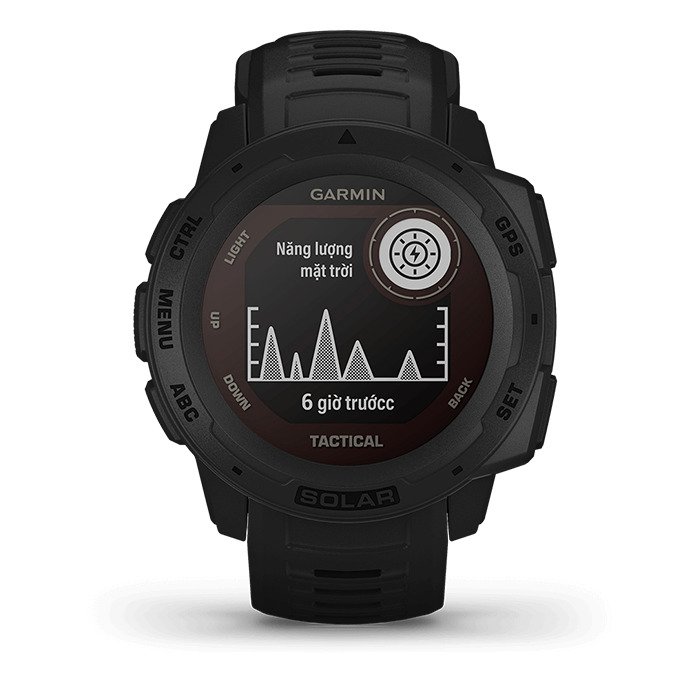 Với công cụ Solar, bạn có thể biết được khả năng hấp thụ năng lượng mặt trời của chiếc đồng hồ Garmin Instinct Solar này. Bạn có thể nhìn thấy một bảng biểu với các thông tin lên xuống thể hiện khả năng hấp thụ của đồng hồ trong 6 tiếng gần nhất từ 0 cho đến 200%. Và để nhìn cụ thể hơn bạn có thể xem ở mục công cụ phía dưới hoặc ngay trực tiếp trên ứng dụng Garmin Connect để xem lại những ngày trước nữa.