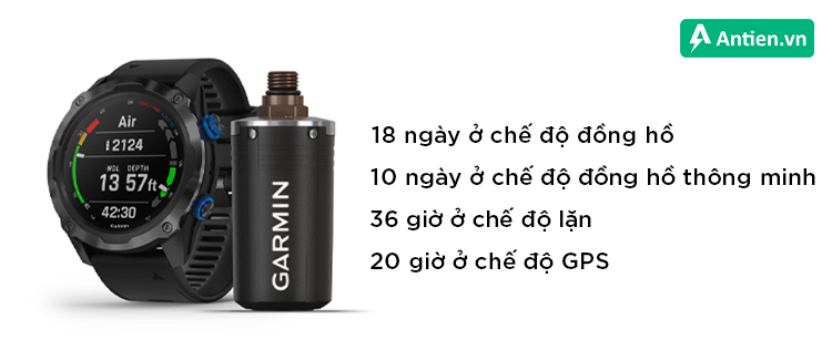 | Thời gian sử dụng | Chế độ lặn: Lên đến 36 giờ; Đồng hồ thông minh: Tối đa 18 ngày; Đồng hồ thông minh: Tối đa 10 ngày; Chế độ GPS/Đo nhịp tim: Lên đến 20 giờ; Chế độ UltraTrac ™: Tối đa 28 giờ |