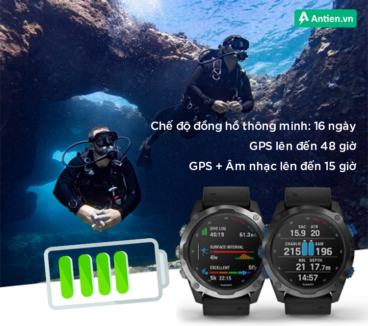• Thời lượng pin: Đồng hồ thông minh: Lên đến 16 ngày; Chế độ xem tiết kiệm pin: Lên đến 50 ngày; GPS: Lên đến 48 giờ; GPS + Âm nhạc: Lên đến 15 giờ; Chế độ GPS tối đa pin: Lên đến 96 giờ; Chế độ lặn: Lên đến 80 giờ; Chế độ lặn với Descent T1: Lên đến 32 giờ; Hoạt động GPS thám hiểm: lên đến 35 ngày