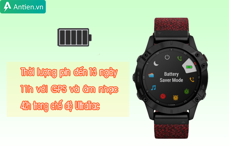 Thỏa sức trải nghiệm và khám phá mọi hành trình với người bạn đồng hành Garmin Fenix 6 Sapphire Black DLC, cho dung lượng pin bền bỉ đến 13 ngày sử dụng trong chế độ đồng hồ đeo tay thông minh, chế độ GPS và âm nhạc tối đa 11 giờ, 42 giờ trong chế độ UltraTrac; chế độ quản lý công suất tùy chỉnh cho phép bạn xem và kiểm soát ảnh hưởng của các thiết lập và cảm biến lên tuổi thọ pin.