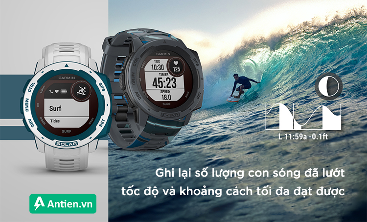 Đơn giản chỉ cần nhìn vào cổ tay của bạn, Garmin Instinct Solar Surf Edition luôn cập nhật các điều kiện đại dương để giúp bạn bắt được con sóng hoàn hảo. Đồng thời ghi lại số lượng con sóng đã lướt, tốc độ và khoảng cách tối đa đạt được di chuyển bằng cách sử dụng cấu hình hoạt động lướt sóng.
