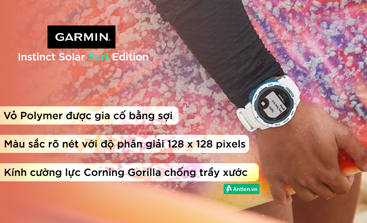 Đồng hồ lướt sóng Instinct Solar Surf Edition được trang bị kích thước 0.9'' x 0.9 (23 x 23 mm) với vỏ polyme được gia cố bằng sợi, kính cường lực Corning Gorilla chống trầy xước về mặt hóa học và đáp ứng các tiêu chuẩn quân sự 810G của Mỹ về khả năng chịu nhiệt, sốc và nước (lên đến 100 mét)