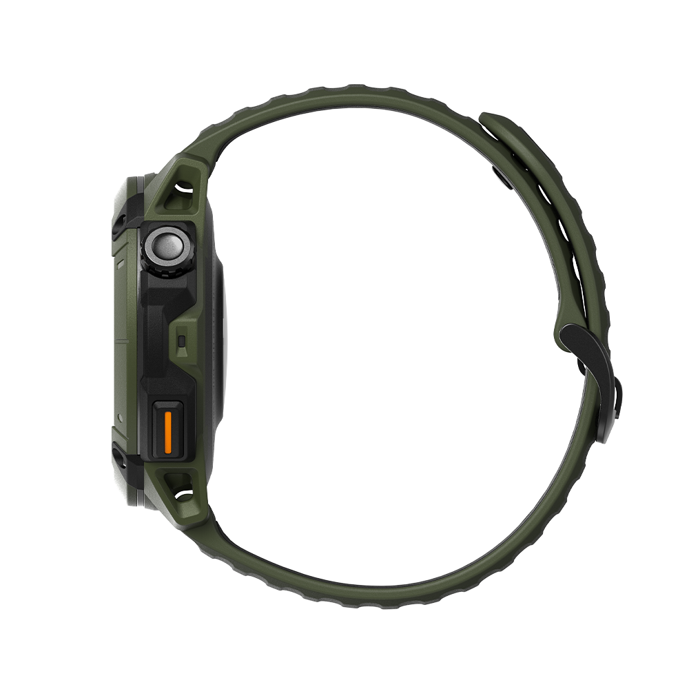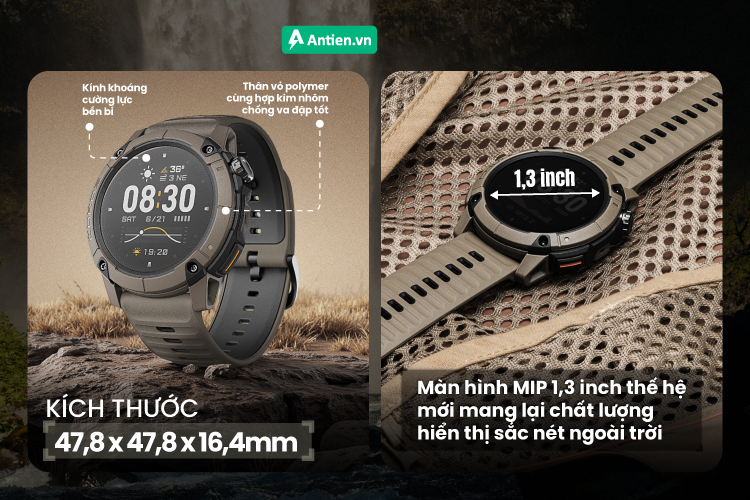 Sở hữu kích thước 47,8 x 47,8 x 16,4mm, trọng lượng chỉ từ 41g đến 68g tùy dây đeo, NOMAD mang lại cảm giác chắc chắn nhưng vẫn nhẹ nhàng khi đeo lâu. Viền bezel được thiết kế nhô cao, giúp bảo vệ màn hình khỏi va đập trong những tình huống khắc nghiệt.